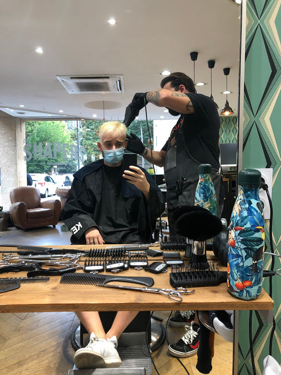 Ce jeudi, j’ai pris rendez-vous chez les amis de Shapers à Aix-en-Provence (que je recommande vivement d’ailleurs, si jamais vous êtes du coin) pour qu’il s’occupent de cet hasardeux projet. Après m’avoir demandé le pourquoi du comment, s’être gentiment foutu de ma gueule, on se lance : décoloration des longueurs de cheveux, décoloration des racines, pose de la couleur, qui est finalement quelque chose d’un peu plus gris que blond, histoire de faire ressortir mes magnifiques yeux (bah quoi ?).