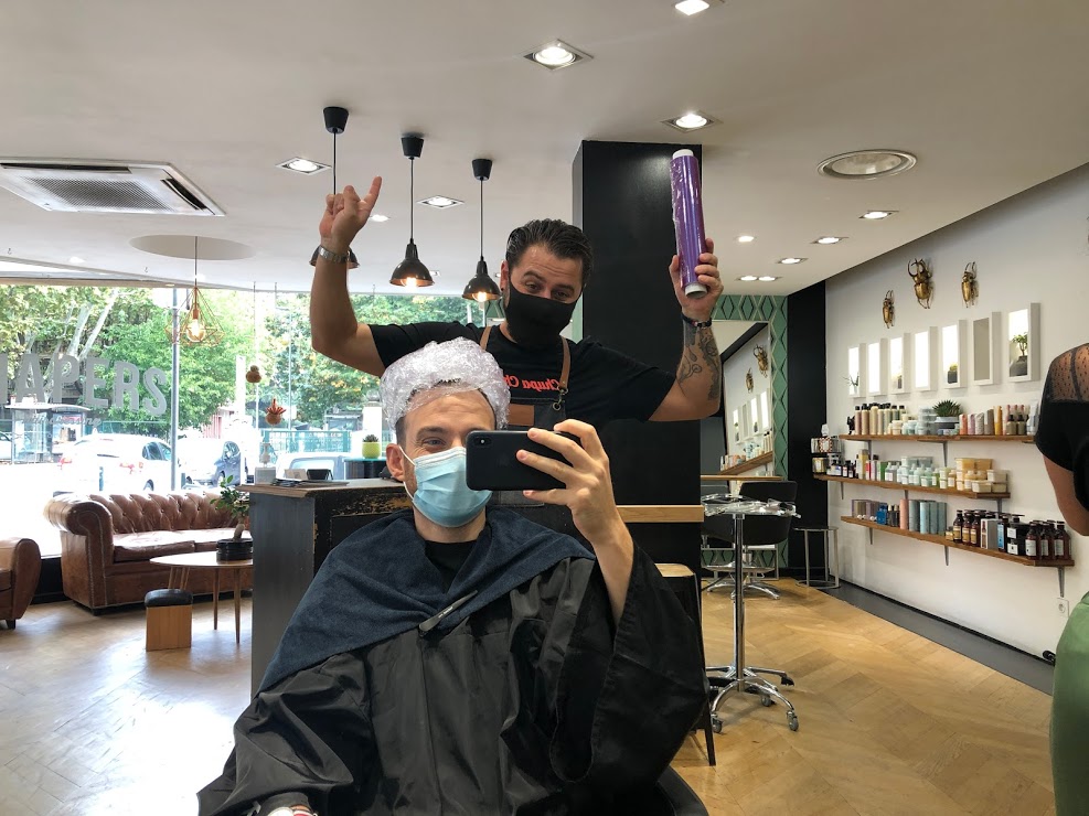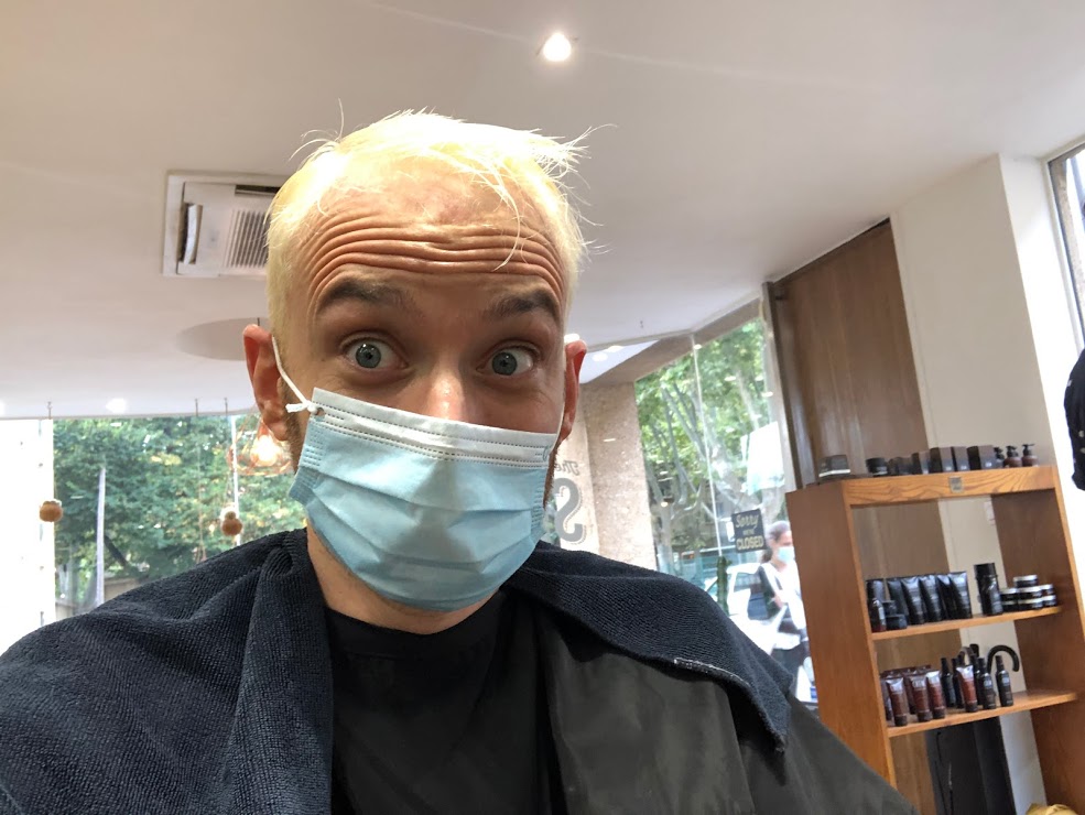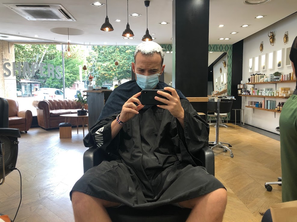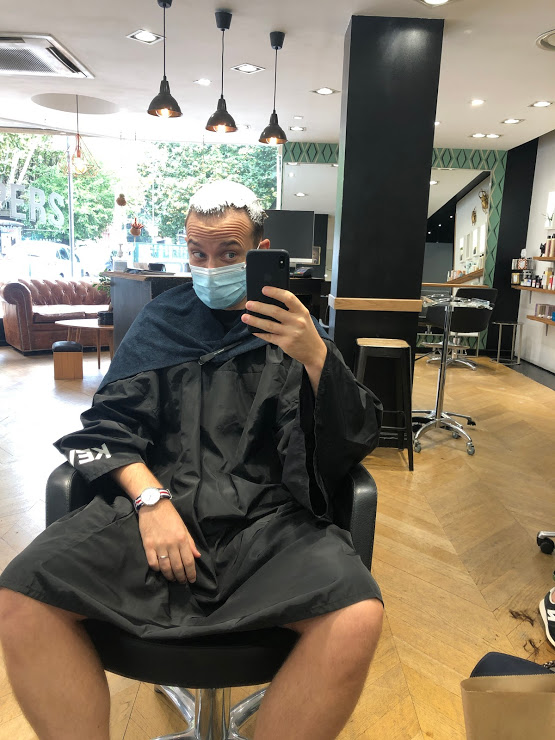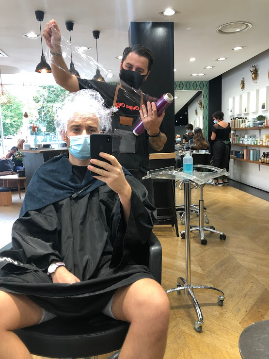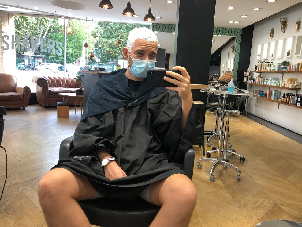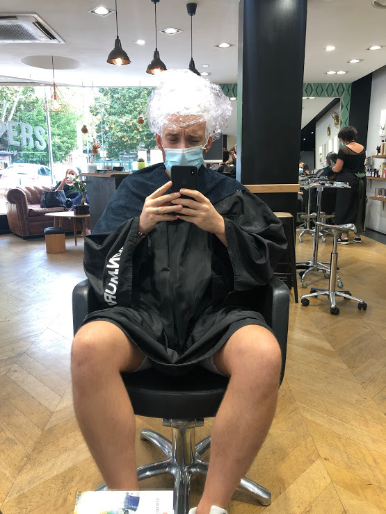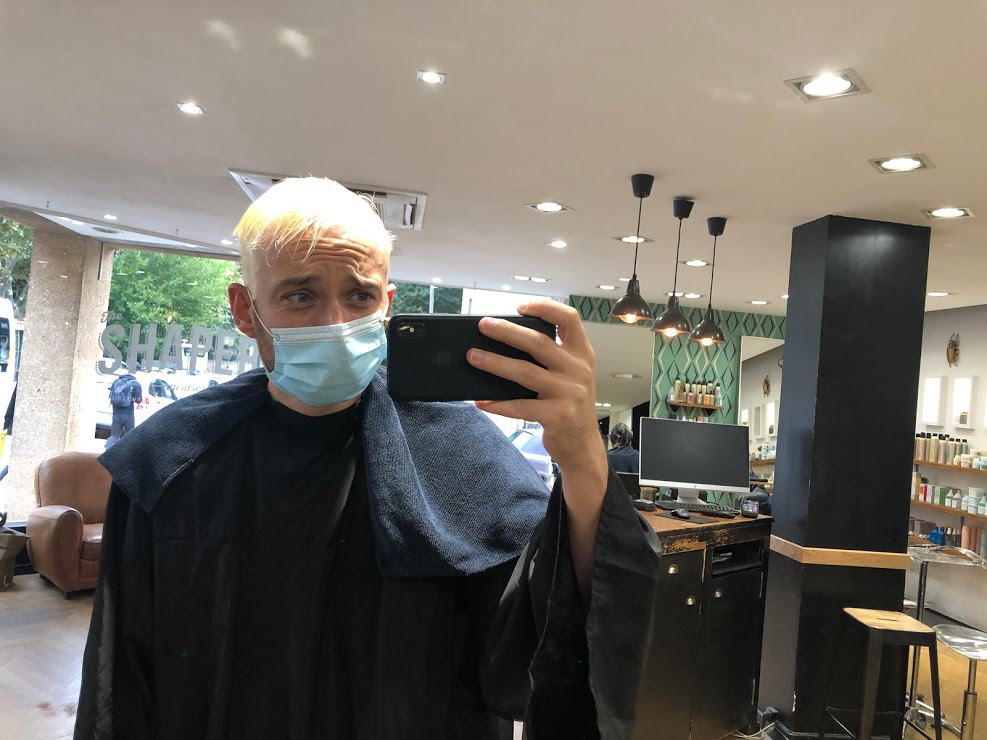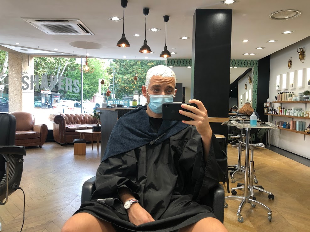 Quatre heures. Il aura fallu quatre heures pour venir à bout des plusieurs phases de décoloration, puis de la pose du « vernis » qui m’aura donné la couleur définitive du cheveu. Ça laisse le temps de se dire qu’on est en train de faire une connerie.